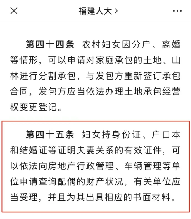 2024年4月9日,福建人大官网发布了《福建省妇女权益保障条例》,该《条例》由福建省第十四届人民代表大会常务委员会第九次会议于2024年3月27日通过,今年6月1日起施行。其中第四十五条明确:妇女持身份证、户口本和结婚证等证明夫妻关系的有效证件,可以依法向房地产行政管理、车辆管理等单位申请查询配偶的财产状况。有关单位应当受理,并为其出具相应的书面材料。